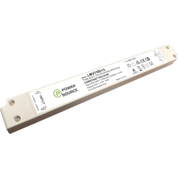 Power Source LMVT-100-12 12V DC 100-WATT AC phase-cut (TRIAC) and 0-10V dimmable linear LED Driver. Contact ADM for details.