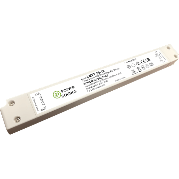 Power Source LMVT-30-12 12V DC 30-WATT AC phase-cut (TRIAC) and 0-10V dimmable linear LED Driver. Contact ADM for details.