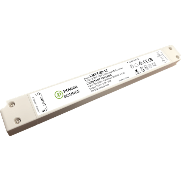 Power Source LMVT-60-12 12V DC 60-WATT AC phase-cut (TRIAC) and 0-10V dimmable linear LED Driver. Contact ADM for details.